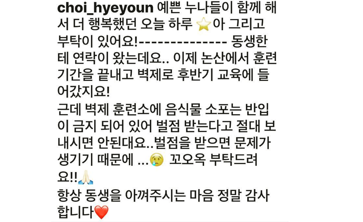 “Today was an even more joyful day because it was spent with pretty noonas. Oh, and I have a favor!——— I got a message from my younger brother.. he has finished his recruit soldier training at Nonsan and is now in Byeokje to receive the second-half of his training! However, it is forbidden to send any packages containing food to the Byeokje Training camp and if any soldier receives such packages, they will receive penalty points so please refrain from sending these types of parcels and packages.. because receiving penalty points causes problems… I ask that everyone please do me this favor!! Thank you for always having the heart to cherish my brother.”
