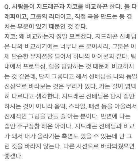 One particular question answered by Zico addresses the issue of the Block B leader being compared to G-Dragon.