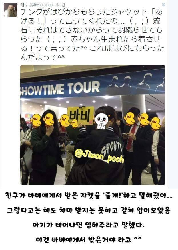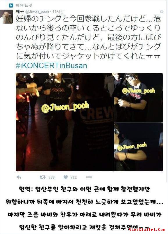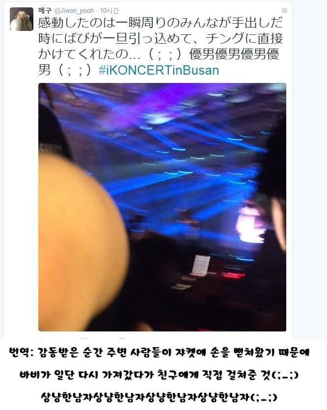 I attended the iKON concert with my pregnant fan and watched from the back since it might have been dangerous… But then Bobby and Chanwoo came down together and noticed us. After noticing us, Bobby saw my pregnant friend and put his jacket around her T_T