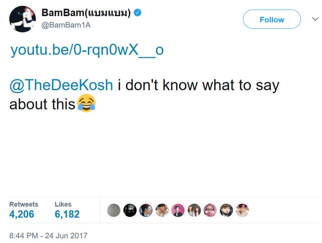 Bambam ended up watching the video and tweeted a link to it, with the words “I don’t know what to say about this.”