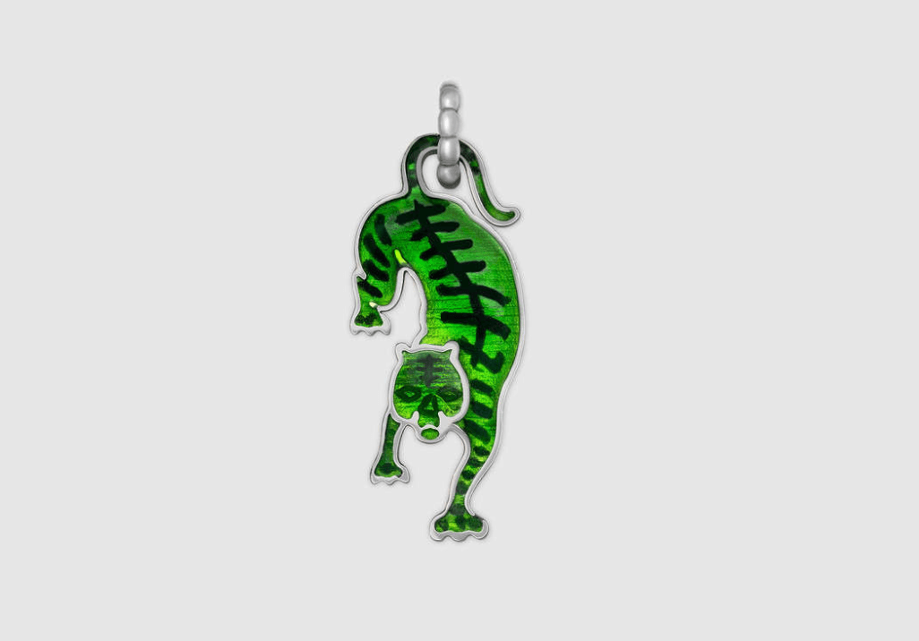 The pendants are Red and Green Gucci Tiger Pendants in Silver.