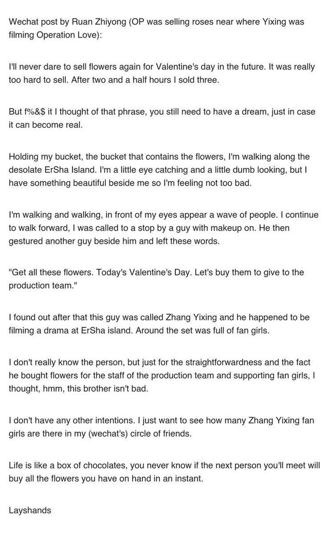 Fans are remembering when Lay took a moment from filming Operation Love to purchase every flower the seller owned for the production crew and fans.