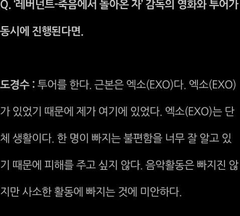 “I’m a member of EXO. I would reject any offers that would effect the group. I identify myself with EXO. EXO is the reason I am where I stand and where I will be in the future. A member missing at group event being an inconvenience? Yes, I know this for a fact. I really do not wish to make my members uncomfortable. I bet my members think the same as well. There is actor Do Kyungsoo in me but in the depth of my identity, there is also EXO D.O. I am both actor Do Kyunsoo and EXO D.O.”