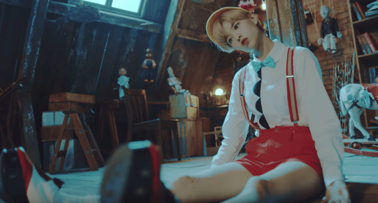 JungyeonJust next to Jungyeon is a Pinocchio hanging from the car’s rearview mirror, while she appeared as a puppet who had come alive in the Korean MV.