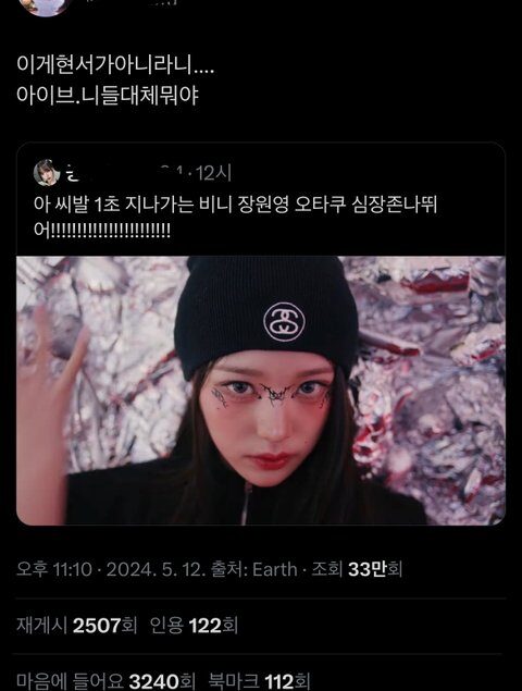 The tweet that started the conversation is below. The post being retweeted is a recent picture of Wonyoung, with the caption, “Ah f*ck, beanie-Jang Wonyoung that came up for 1 second is making my otaku heart f*cking race!!!!!!!!!!!!!!!!!!!!!”