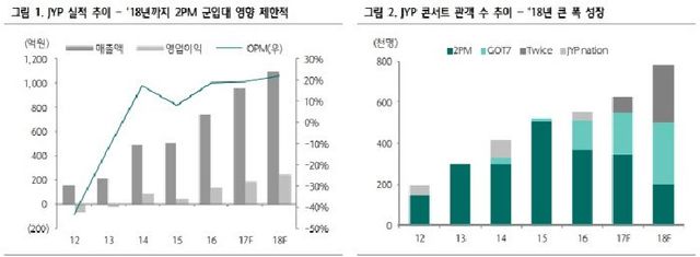 The graph on the right shows the breakdown of tickets sold between JYP’s three main groups 2PM, TWICE, and GOT7 since 2012. Ticket sales for bothTWICE and GOT7 are expected to skyrocket in 2017 and 2018 while 2PM’s will drop as more members enlist in the military.