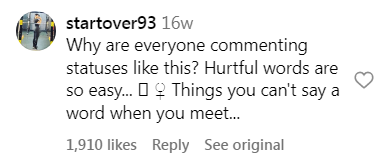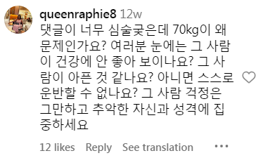 • “The comments are so mean, but why is 70kg a problem? Does that person look unhealthy to you? Do they seem sick? Or are they unable to carry themselves? Stop worrying about that person and focus on your own ugly self and personality.”