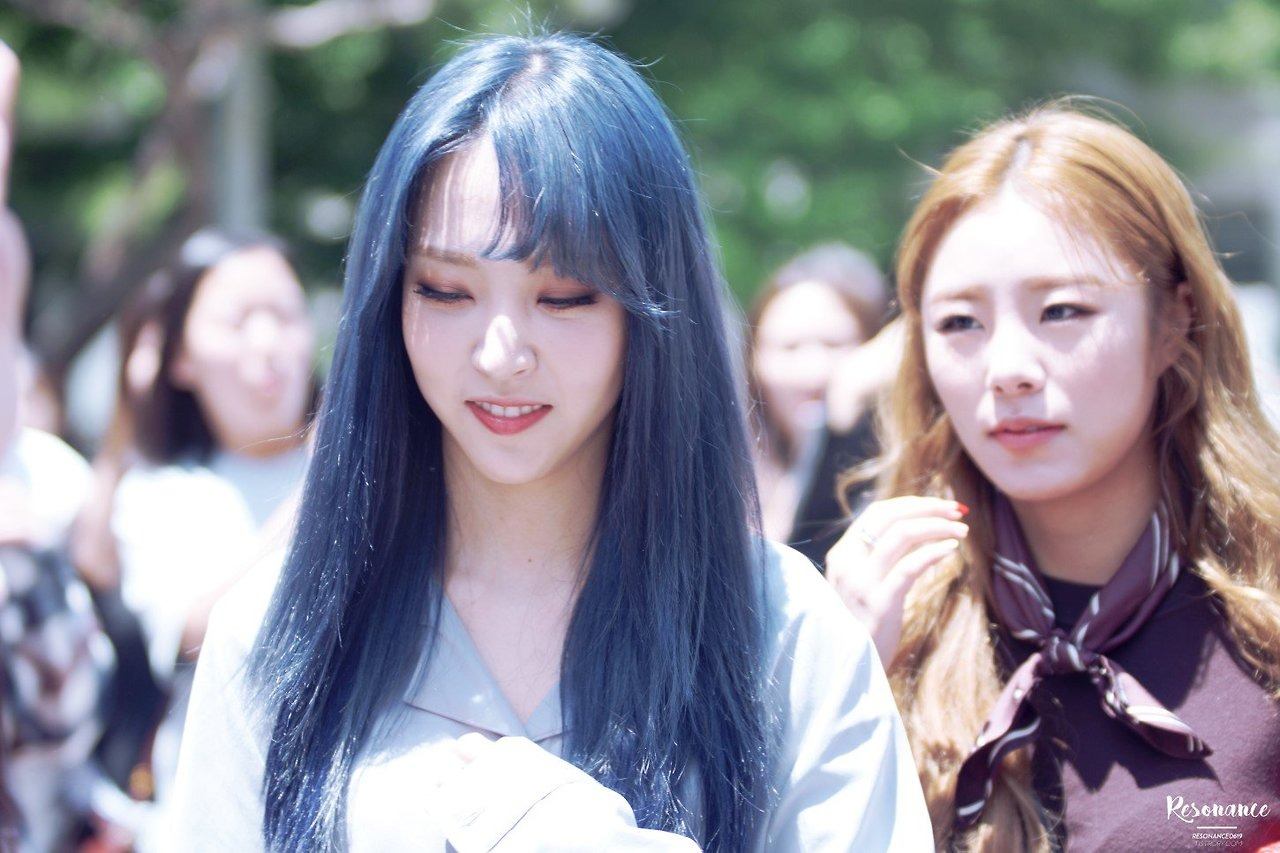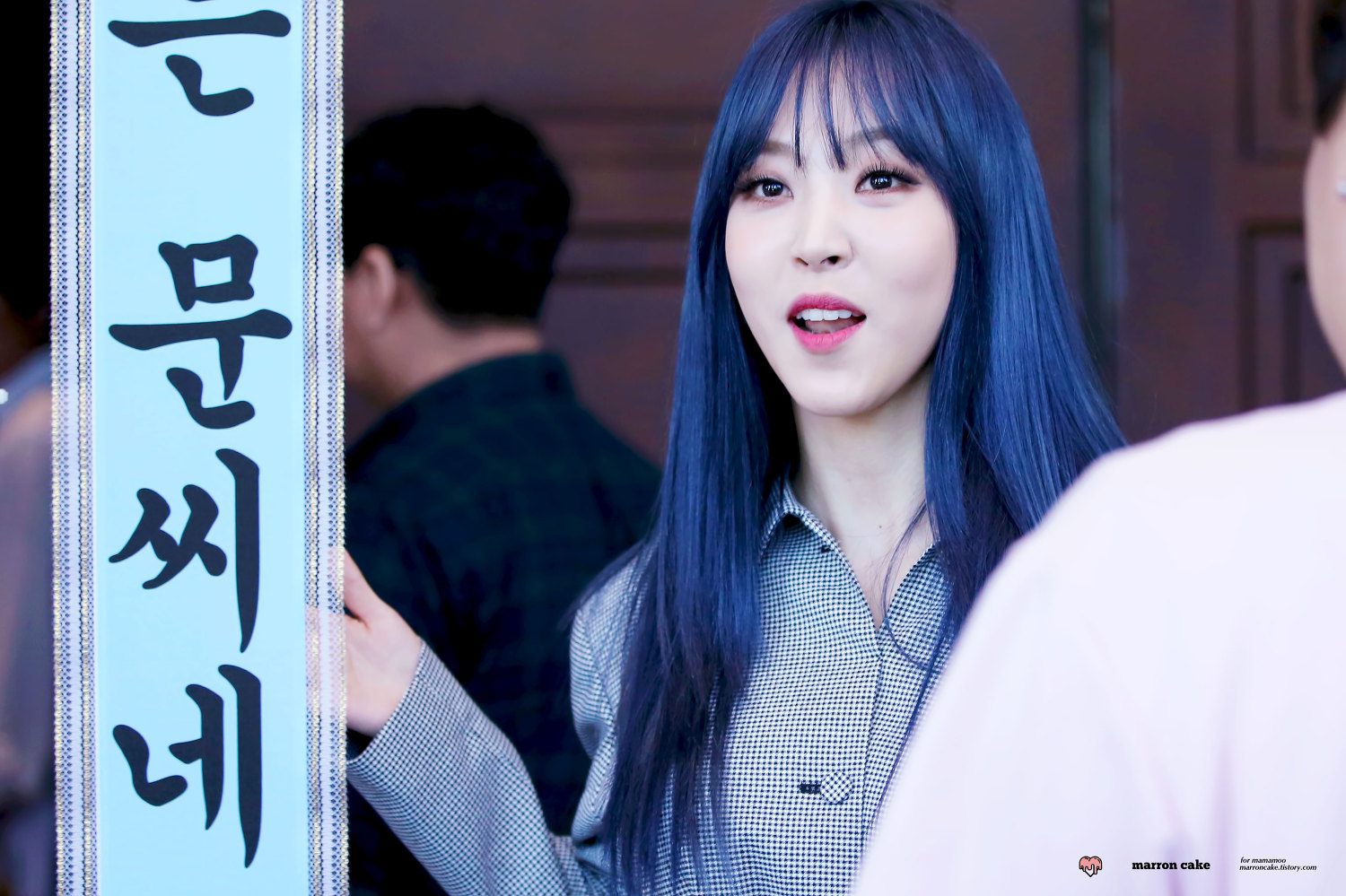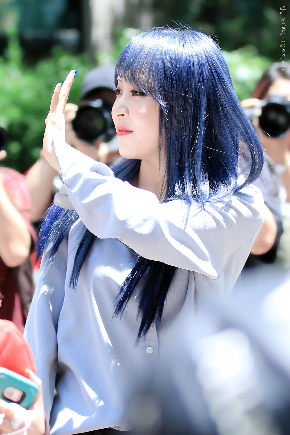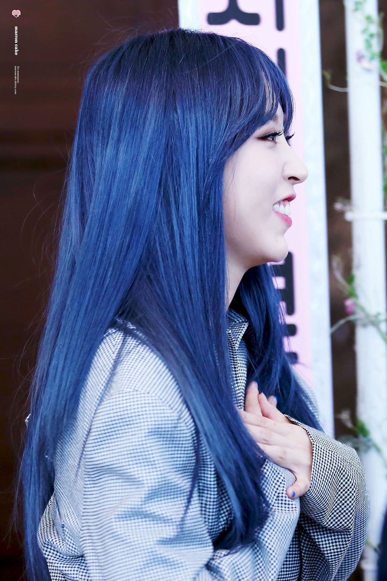 Moonbyul’s new hairstyle is such an intense shade of blue, it almost looks black in some lighting.