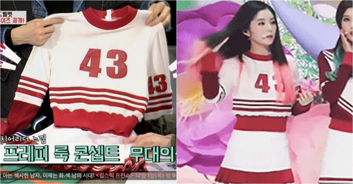 Last year, Irene appeared on Onstyle’s program Laundry Day and revealed a few costumes from Red Velvet’s debut. The outfit was a short sports skirt paired with a thin knitted top used by Red Velvet when they promoted their debut track, “Happiness.”