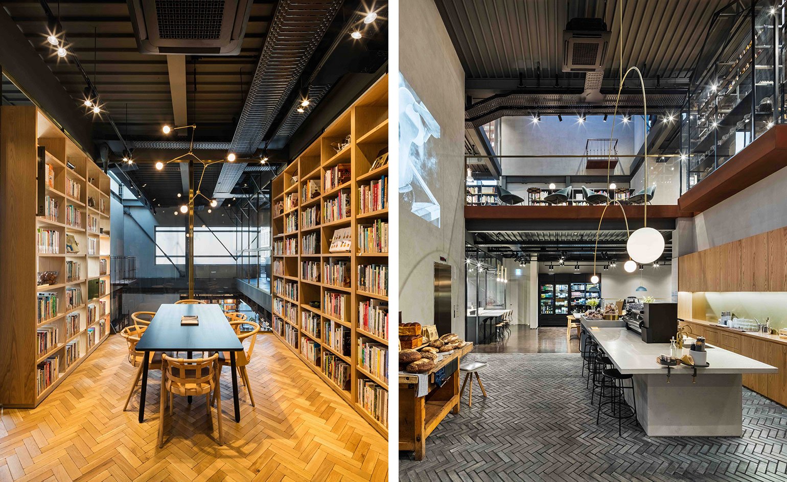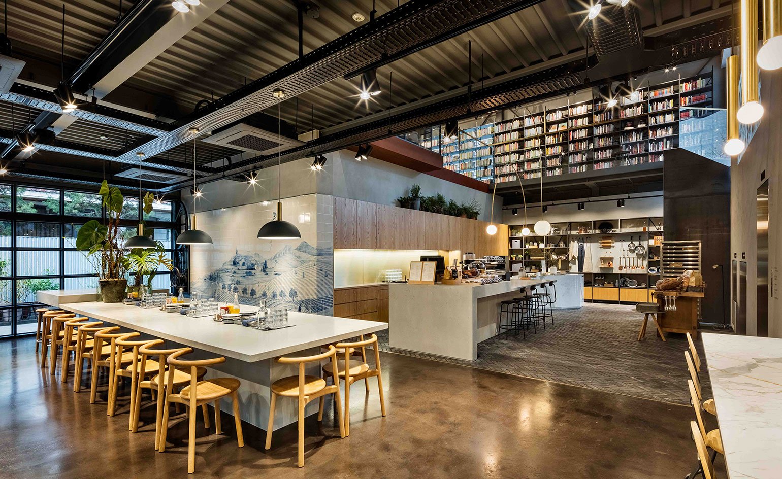 On the third floor, a kitchen space with several cooking stations is made available for visitors to cook with the recipes and ingredients from the library. A dining area for private parties with a greenhouse theme is on the fourth floor.