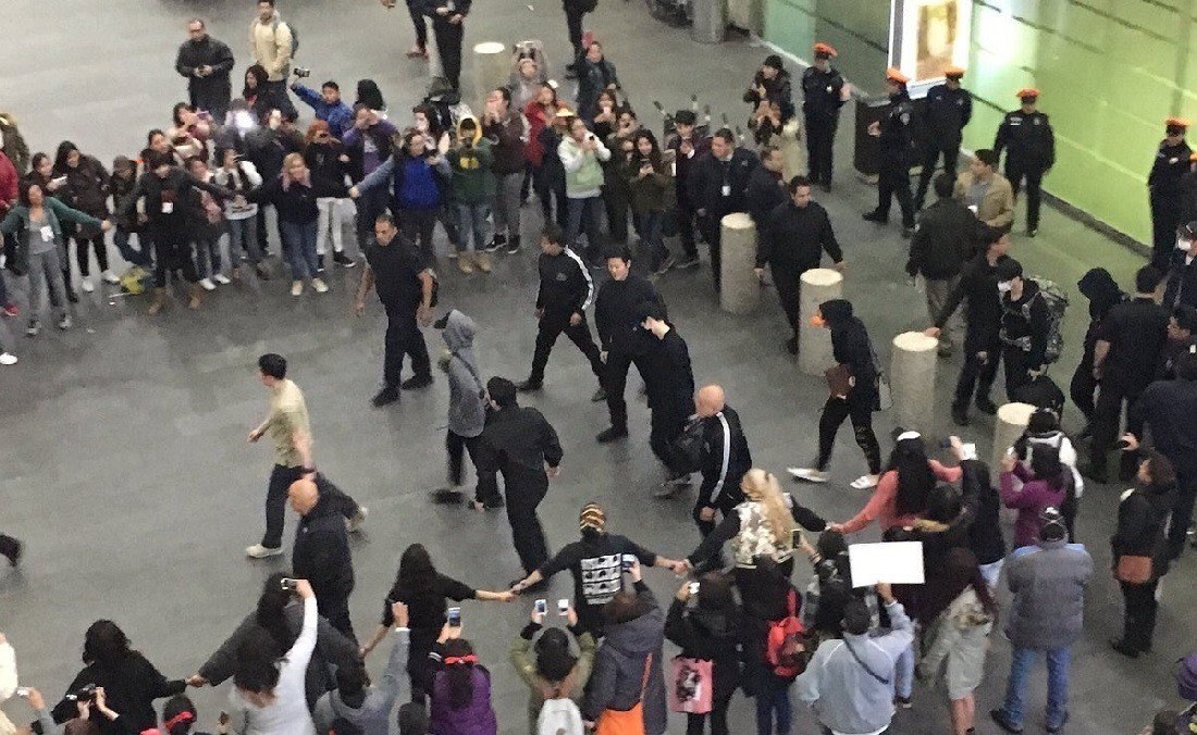 As he walked through the airport, a crowd of fans surrounded him and attempted to get close to him and hand him gifts.