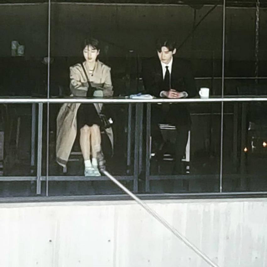 Suzy and Lee Jong Suk sit next to each other looking out of the coffee shop.