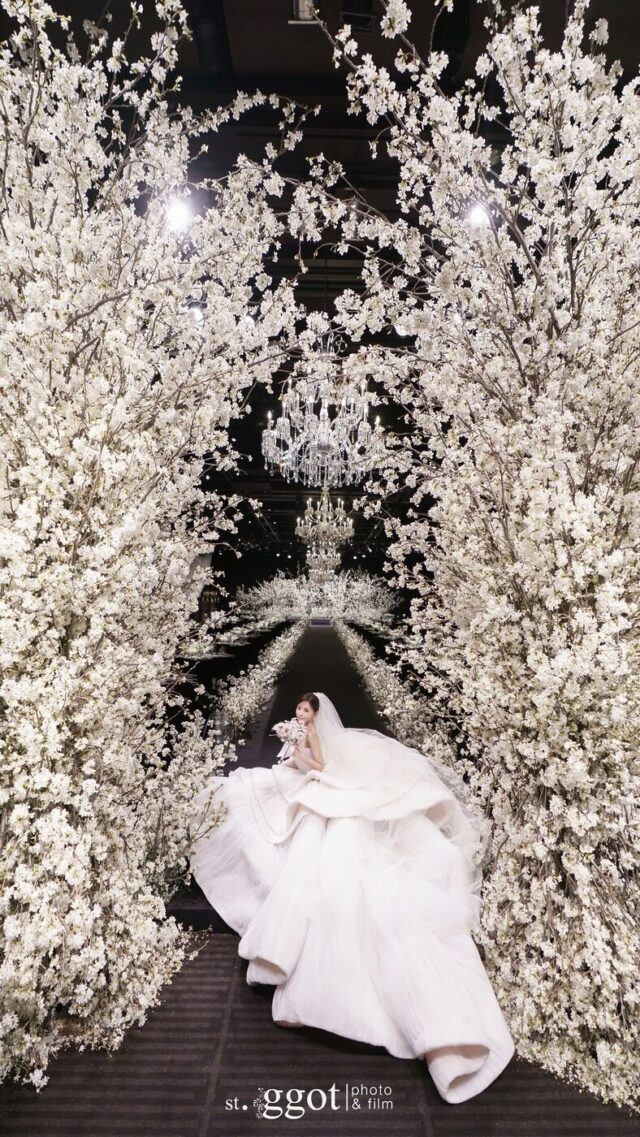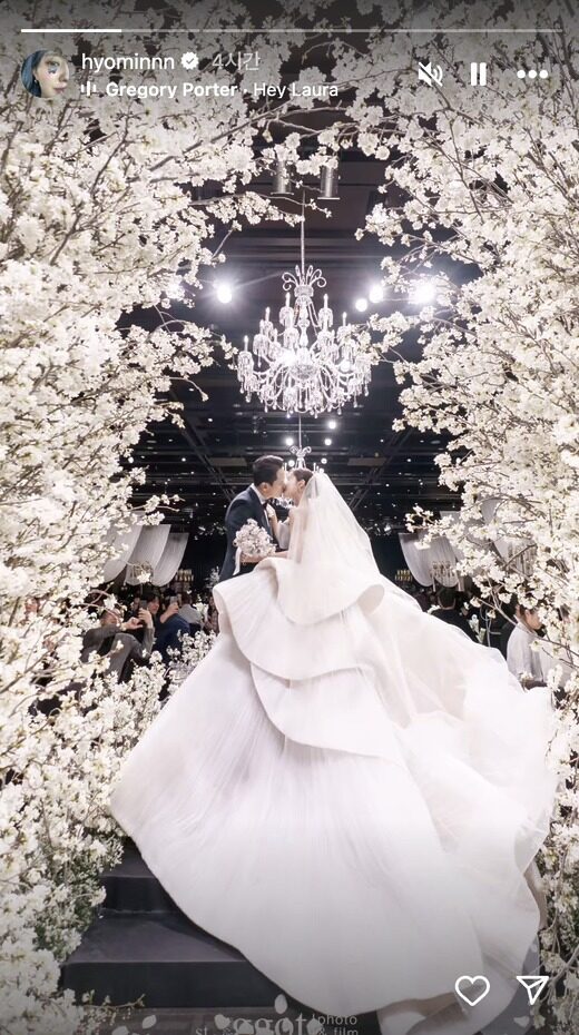 On April 6, T-ARA‘s Hyomin tied the knot with her non-celebrity husband, who reportedly works in finance. Their wedding was a lavish affair, held at a grand hotel that featured fairytale cherry blossoms, celebrity guests, and three gorgeous wedding gowns.