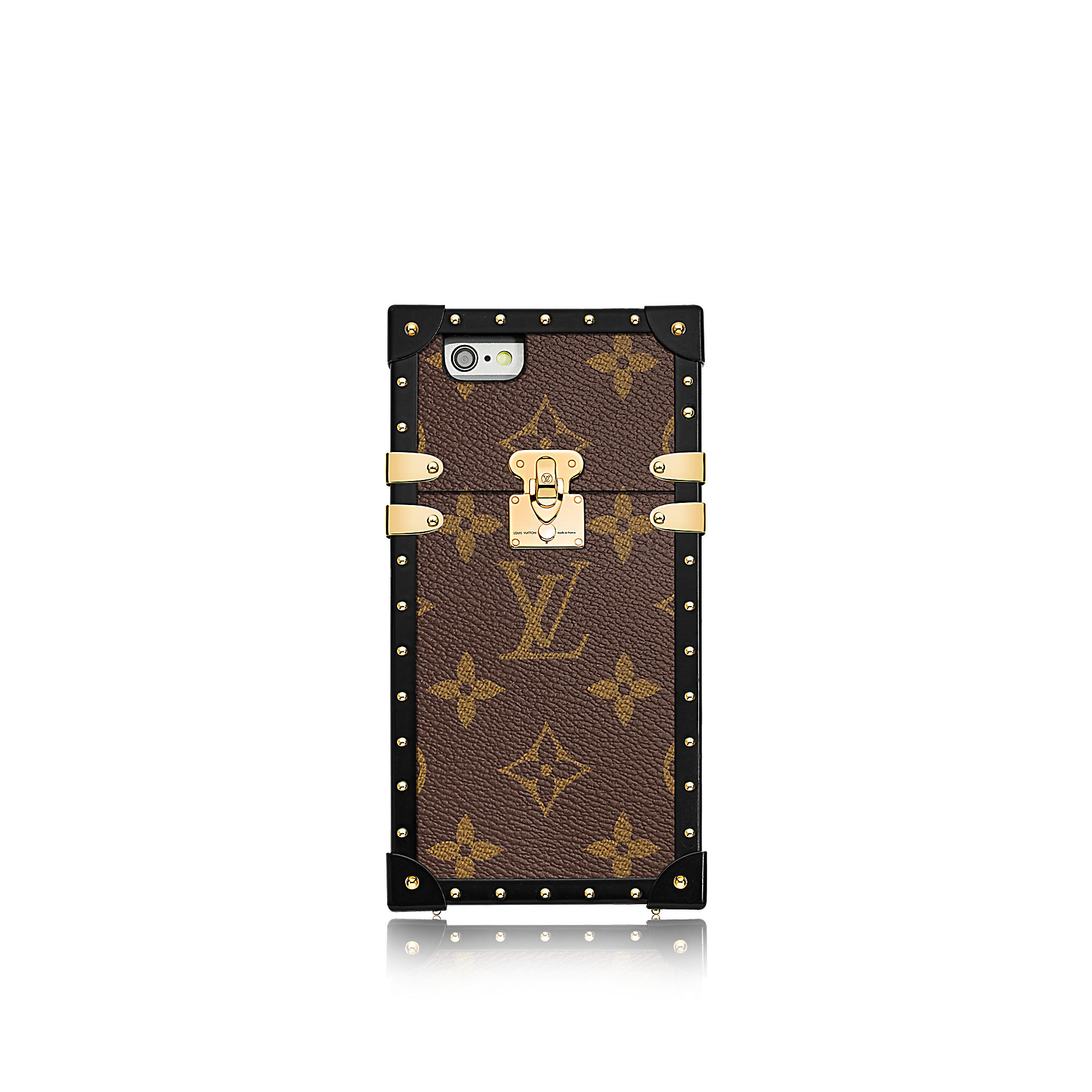 The phone case that she’s holding in her hand is Louis Vuitton’s Eye-Trunk for iPhone 7 Plus.