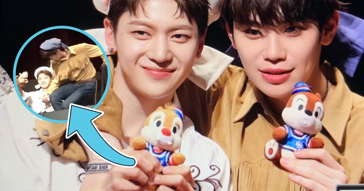 Seok Matthew and Kim Taerae sat beside each other on top of a table, playing with fan-given Chip and Dale chipmunk plushies, when the table suddenly collapsed, taking the boys with it.