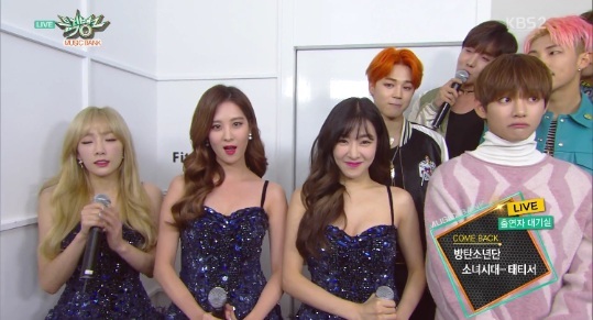 Both Girls’ Generation-TaeTiSeo and boy group BTS recently held their official comeback stages on KBS Music Bank where both groups briefly met backstage on the air.
